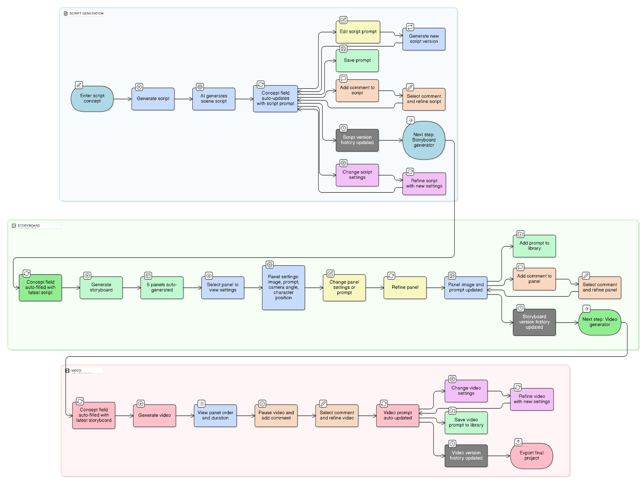 Solution: Focused on essential flows and used a modular structure (Script → Storyboard → Video) to move fast and stay aligned.