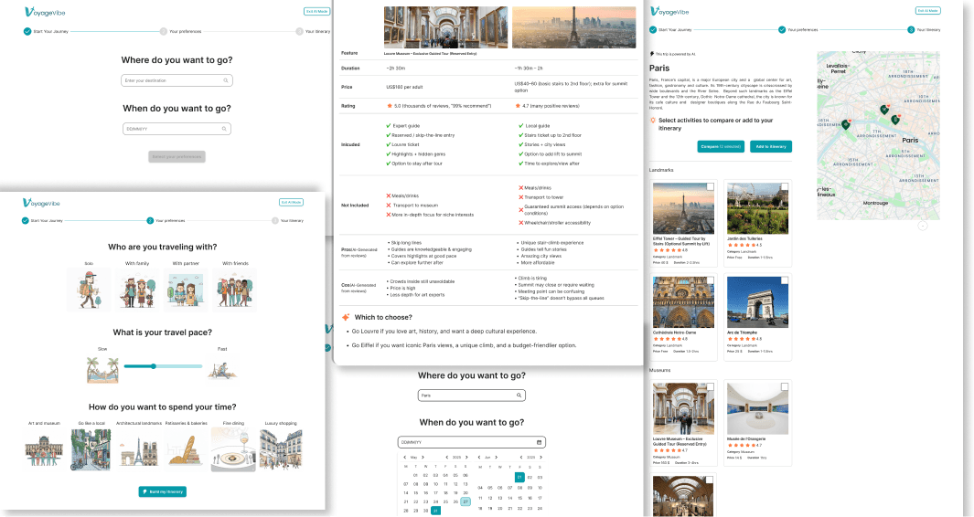 If I were to redesign VoyageVibe, I would enhance the AI feature with a conversational chatbot. Users could interact through a mix of guided automatic options and free-form input to refine their itinerary. This approach would make planning more interactive, personalized, and engaging, while still leveraging AI for efficiency.